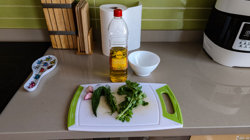 А для приготовления соуса потребуется оливковое масло (самое обычное), пара крупных зубчиков чеснока, укроп, петрушка (или кинза), соль и перец.