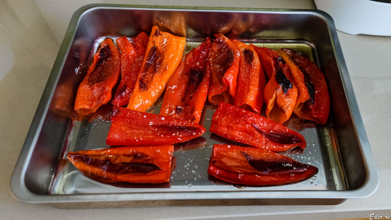 Противень смазываем маслом, раскладываем перцы на противне так, чтобы они друг друга не накрывали, обязательно сверху смазываем маслом как следует, солим - желательно крупной солью.