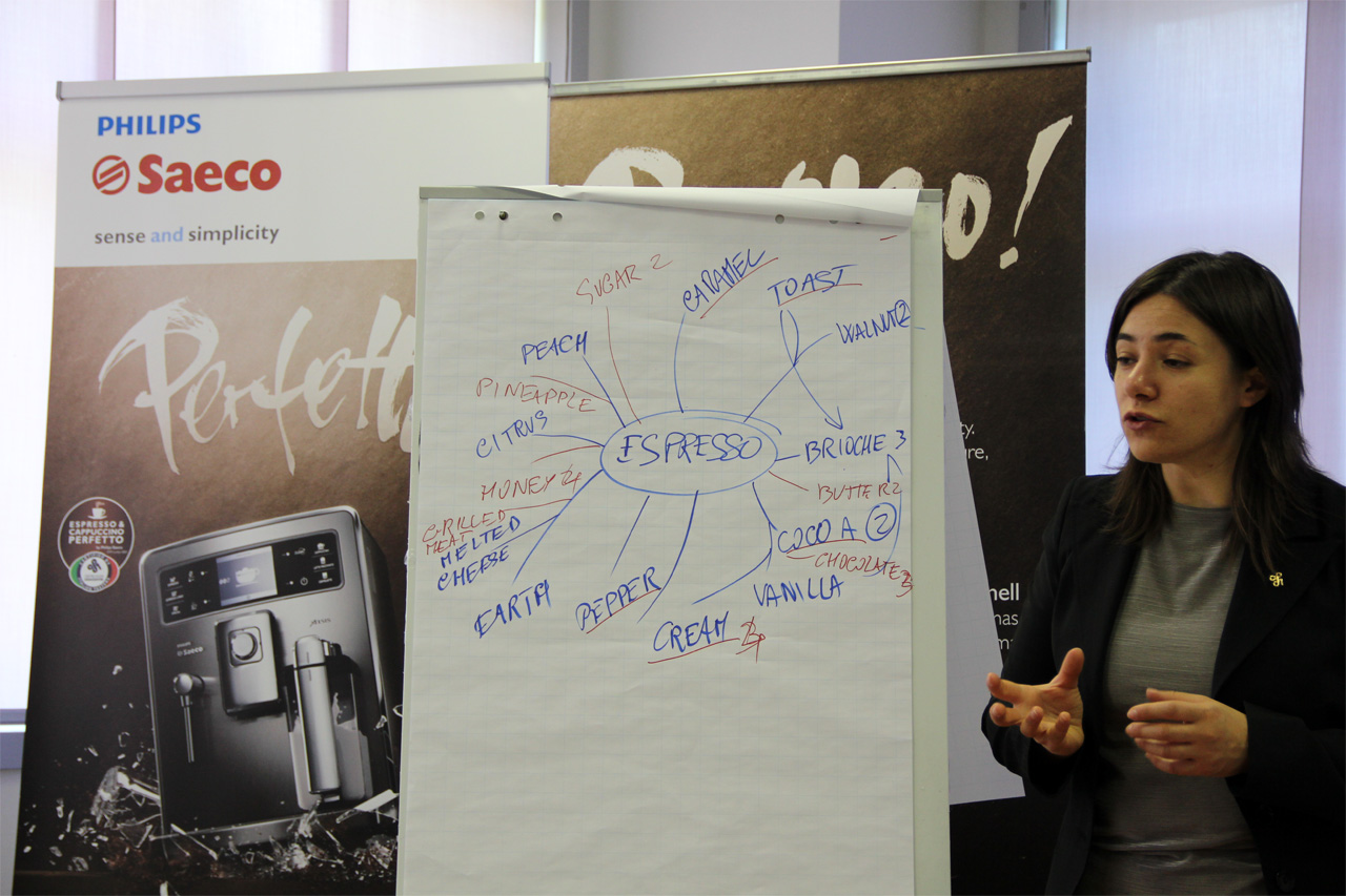 Нам выдавали по чашечке эспрессо, приготовленного в кофемашине (Saeco, разумеется) из определенного сорта кофе. И мы должны были отметить по схеме составляющие запаха и вкуса. Все это дело потом анализировал специалист, которая в результате давала оценку напитку.