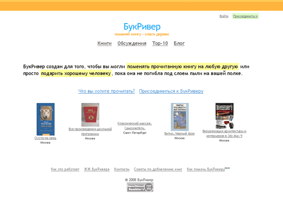 Интересный сервис - обмен книг БукРивер. Регистрируетесь (в основном, чтобы указать город, так как участвуют пользователи из различных городов), пишете, какие книги вы готовы обменять и на что. Также есть возможность подарить какие-то книги, которые вам не нужны, и в свою очередь получить в подарок что-то, что вам нужно. Книги для обмена собраны в подробный каталог. Судя по Top10, сервис вполне работает - есть пользователи, которые обменяли по 3-4 десятка книг. Еще там есть форумы для обсуждения прочитанных книг.