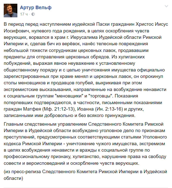 Но распяли его всё таки скорее всего за ловлю покемонов в главном иудейском Храме. Главный раввин потребовал смертной казни за оскорбление чувств-с верующих, а генеральный прокурор умыл руки.