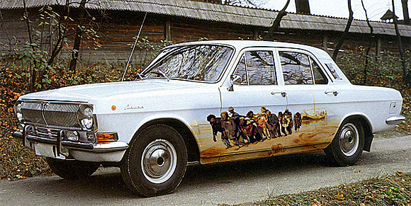 ilych: У нас по Ростову ездил старнький опель (?) с шикарной аэрографией из Кин-Дза-Дзы. С пепелацами, пустыней, Уэфом и Господином Би... Даже иллюминатор в стенке двери был. Но... Хозяин разбился два года назад на трассе Ростов-Таганрог. Где это чудо сейчас - понятия не имею. Фотографию могу у жены спросить.