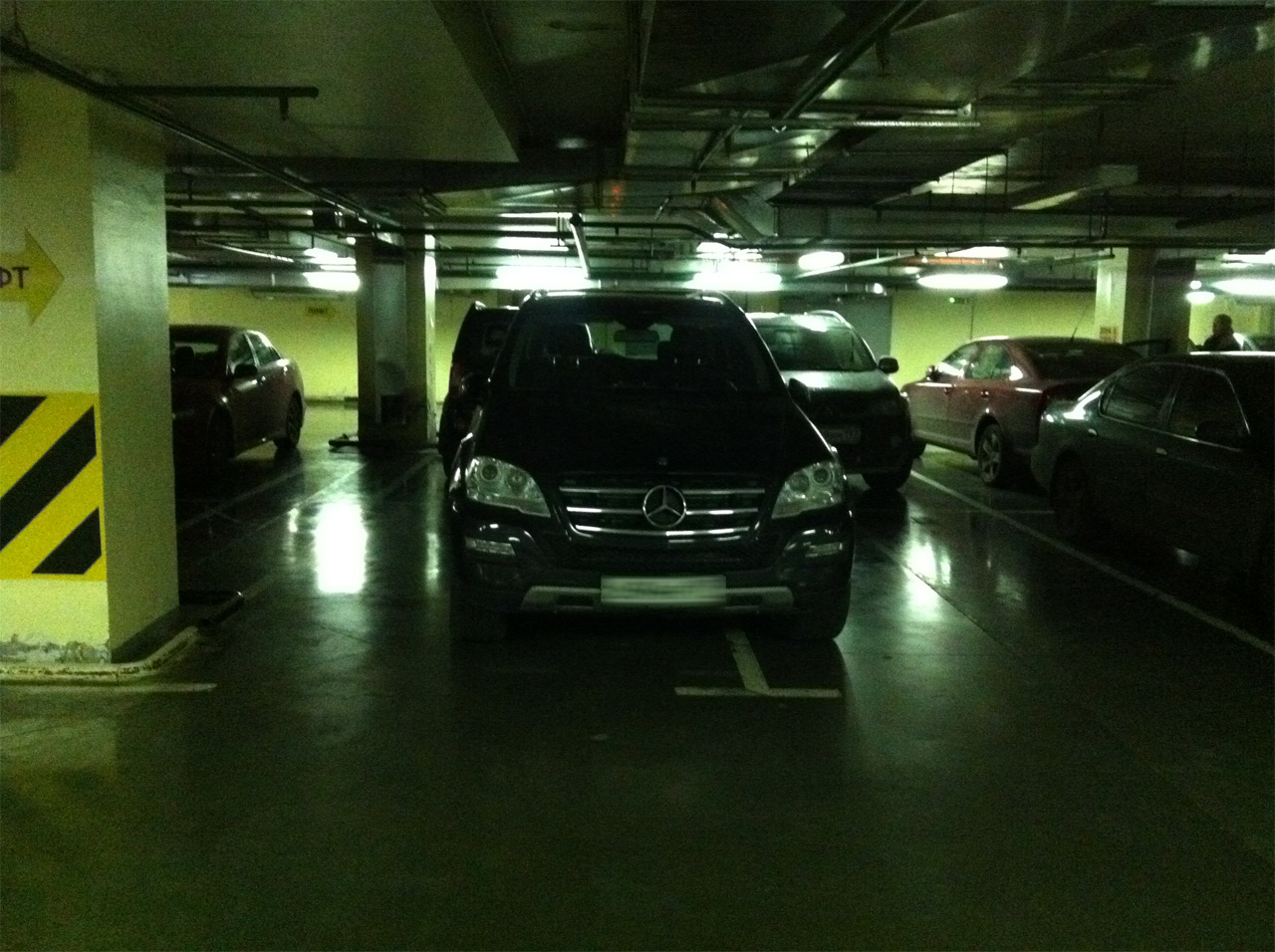 Не оправдываю козлика на ML'ке, но всё же очень интересно: что мешает строителям подземных парковок ставить колонны не снаружи парковочных мест, а изнутри (там, где у этого мурзика багажник) -- на границе четырёх мест? Ведь с точки зрения маневрирования это однозначно удобнее -- колонна не мешает парковке.