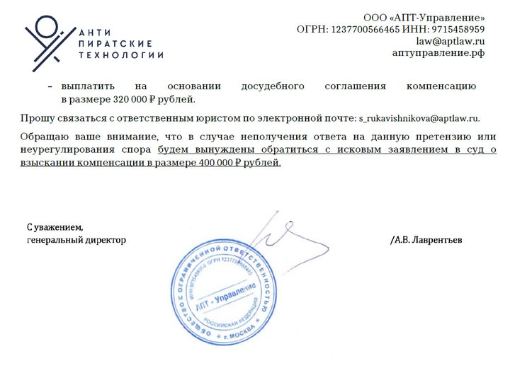 Из любопытства заглянул в Консультант+. Нашел 16 дел данной конторы ТОЛЬКО дошедших до суда по интеллектуальным правам (это третья инстанция по данной категории) - все иски удовлетворены, примерно половина - частично, т.е. снижена суммы компенсации. Так что вот думайте...