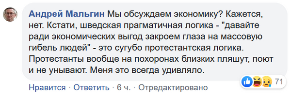 Решение о своей модели действия в эпидемию правительство Швеции принимало на основе консультаций с главным шведским эпидемиологом, которые неоднократно выступал в СМИ и озвучивал свою позицию для шведов. Но он, конечно, же, зря не проконсультировался с Мальгиным и Кармоди, ох, зря!