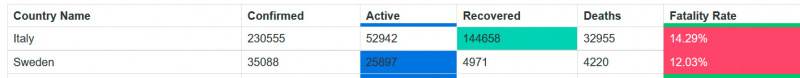 Абсолютные цифры смертей - 32955 и 4220 - сравнивать, конечно, не будем, слишком разные размеры населения, а вот уровень смертности - почему бы и не сравнить? В Италии, где все сделали правильно, смертность 14.29%, в Швеции, где совершили преступление по отношению к людям (по Мальгину и некоторым другим аналитикам, вроде Остапа Кармоди) - 12.03%. В Италии, где все молодцы, смертность - 545 человек на миллион, в Швеции, где власти-преступники - 409.