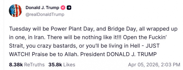 Во вторник в Иране будет одновременно и «День электростанции», и «День моста». Ничего подобного еще не было!!! Откройте, блядь, пролив, вы, сумасшедшие ублюдки, или вам придется жить в аду — ПОСМОТРИТЕ САМИ! Хвала Аллаху. Президент ДОНАЛЬД ДЖ. ТРАМП