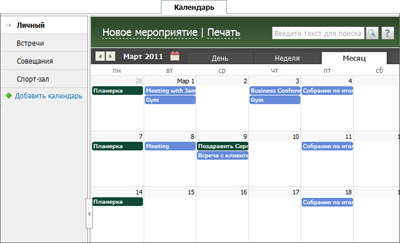 Для каждого сотрудника предусмотрен личный календарь, где он может планировать собственные мероприятия, а также видеть мероприятия, на которые он приглашен другими пользователями. Для планирования общекорпоративных мероприятий в модуле может быть создано неограниченное количество общих календарей (например, "Встречи", "Совещания" и т.д.) с разграничением прав доступа между пользователями.
