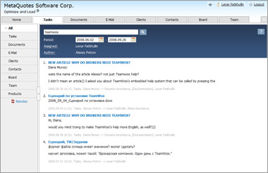 В TeamWox встроена специальная корпоративная поисковая система. Поиск информации ведется сразу по всем базам данных. С помощью встроенного поиска вы сможете быстро отыскать требуемый документ, письмо, задание, клиента или обсуждение на форуме. В этой системе реализована функция морфологического поиска. То есть вы вводите одно слово, а система сама ищет все его вариации. Например, по слову «рынок» система осуществит поиск и по словам «рыночный», «рынки» и так далее. Также доступна мощная система фильтрации - временные рамки, авторы документов, назначенные сотрудники.