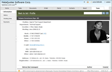 Все о ваших сотрудниках: личные данные, контакты, работа в вашей компании. Здесь можно сохранить все документы, связанные с сотрудником (паспорт, трудовая книжка, ), вести учет рабочего времени и зарплата. Здесь же отражается организационная структура компании с местом сотрудника в ней - таким образом можно выяснить, не является ли данная должность лишней или дублирующей.