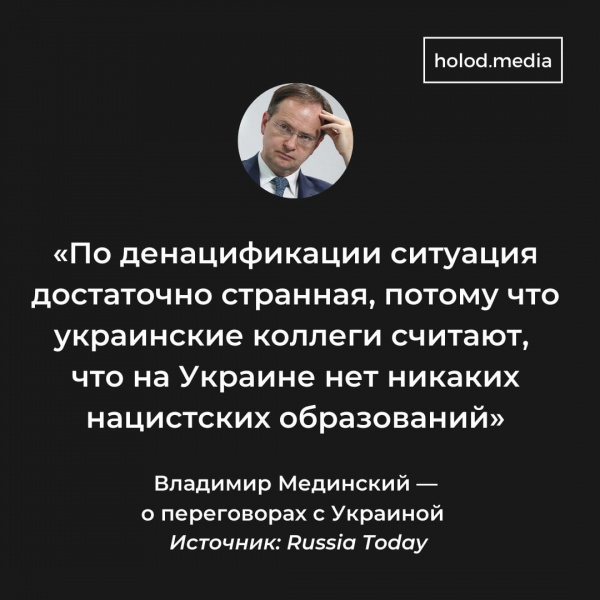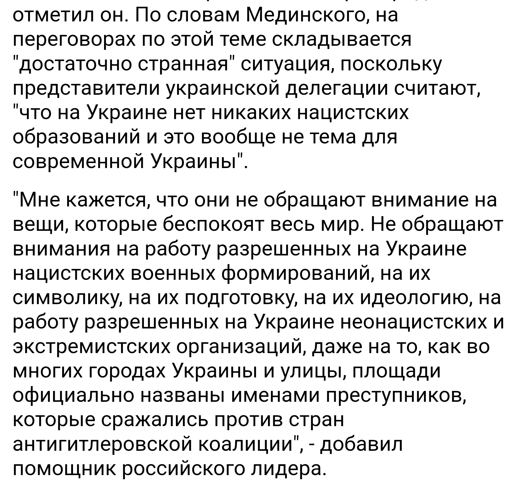 Я думаю, это очень интересное заявления. Для этой шайки эти переговоры один из способов (а может и единственный) вылезти из того дерьма, в которое они себя посадили. Усатый таракан говорил правду - Путин готов сильно подвинуться в своим требованиях к Украине, особенно на фоне того, что они планировали. Кстати, Украина никак не комментирует и не даёт никакой информации о своих требованиях, в отличии от Мединского и компании. Они, правда, не озвучивают главное требование к Украине типа, Украинское правительство перестаёт поддержку и финансирование организаций "Бендера и Гитлер братья навек", "Разбудим Ктулху, а он оживит Бенедру", "Вперёд к победе нацизма" и тд. Такое маленькое требование, чтобы оправдать всё это дерьмо и обелить себя. А украинцы не хотят.
