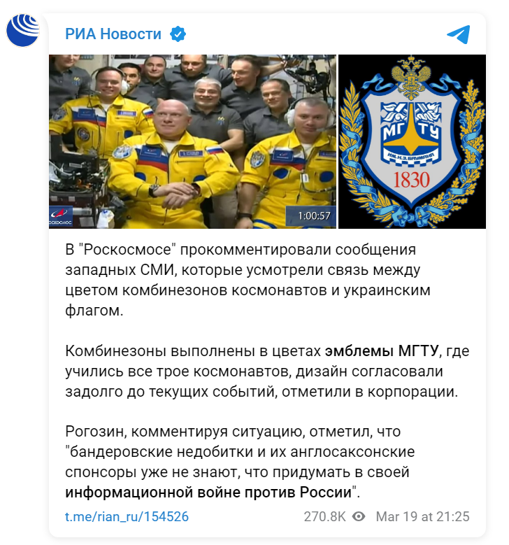19:10, 19 марта 2022 «Роскосмос» объяснил желто-синюю расцветку комбинезонов российских космонавтов