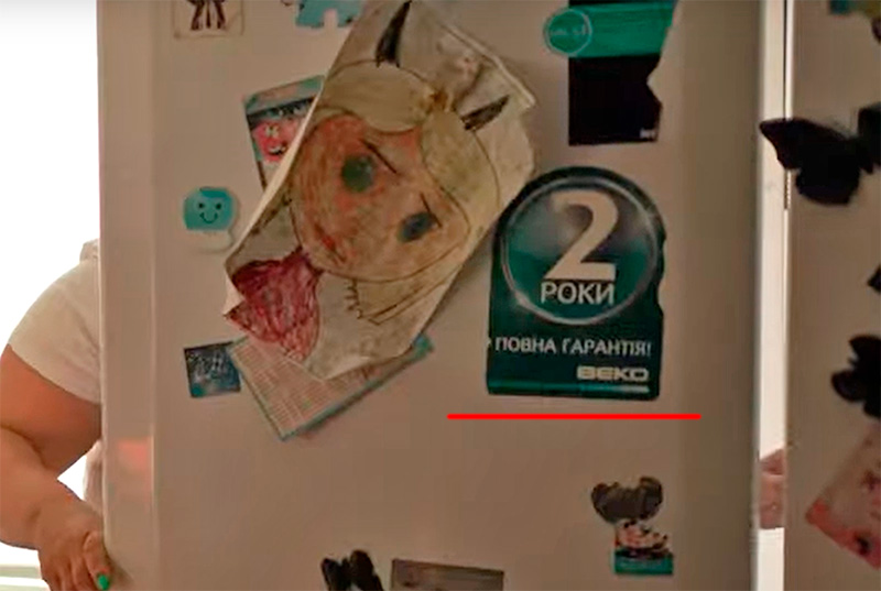 И вот уже в самом конце ролика на отметке 1:24:16 на дверце холодильника можно увидеть вот это - гарантийная наклейка на украинском языке.