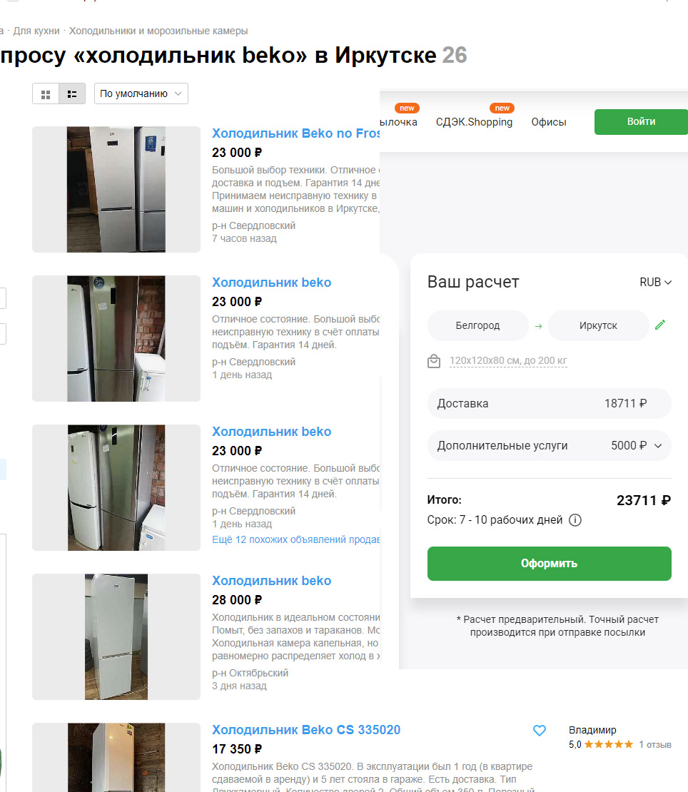 Вот на скрине ниже - стоимость доставки СДЭК Белгород-Иркутск равна стоимости холодильника Beko на Avito в самом Иркутске. Да, можно конечно пытаться подобрать доставку транспортными компаниями, чтобы вышло дешевле ( СДЭК не очень хорошо заточен под тяжелые веса в обрешетке ) Но думаю в самом дешевом варианте это все равно будет стоить более чем пол цены б\у холодильника такого класса как минимум. Можно было бы еще понять холодильник скажем марки KUPPERSBUSCH, но не Beko