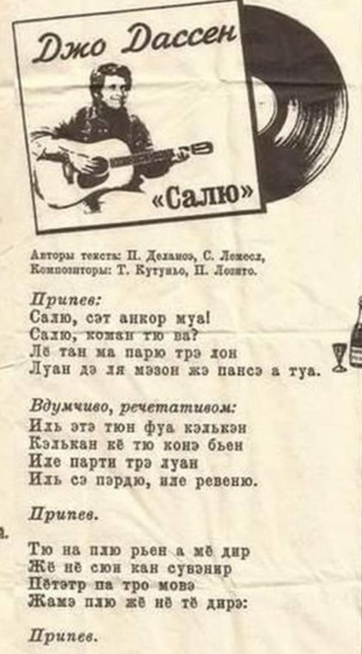 Когда мой двоюродный брат служил в армии, я в каждом письме отсылал ему тексты битлов примерно в таком виде. Он, конечно, прослыл полиглотом. Как-то раз будят его среди ночи старослужащие и ведут в умывальню. Он спросонья малость испугался, но видит: лежит в центре раздетое до трусов тело, подготавливающееся к знатной татуировке, и просит его написать "се ля ви" по-французски. Кузен так и написал, как слышал: se la vi. (Для тех, кто не силен во французском: надобно c'est la vie))))