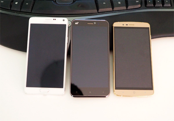 Приехал смартфон ViewSonic v500-3. Заказывал на Dealextreme. Вот он в центре между Galaxy Note 4 и Elephone P8000.