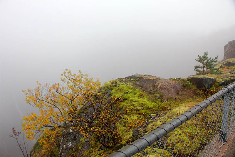 В Норвегии нам показывали площадку над пропастью - вот эту. Именно сюда один турист (американец) попросил встать свою жену, чтобы сделать эффектное фото. И поближе к краю, чтобы было видно, что она над пропастью. Уж и не знаю, сумел он сделать кадр или нет и как он теперь с этим живет, но несчастная женщина сорвалась с уступа (там мокрый мох) и упала в пропасть. Разумеется, погибла.