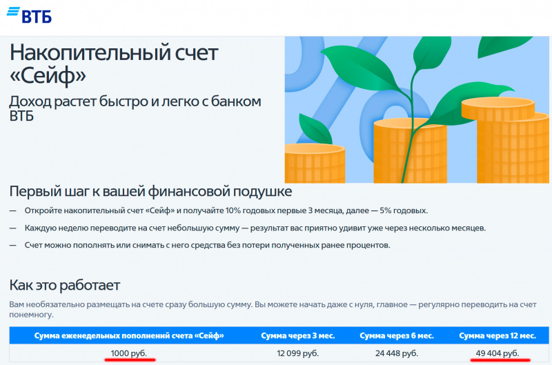 Банк "ВТБ" прям соблазняет открыть накопительный счет под названием "Сейф", где первые три месяца будут выплачиваться 10 процентов, потом по 5. Нужно просто каждую неделю переводить по 1000 и... И в конце года вместо 52 тысяч плюс проценты (в году 52 недели) ты получишь 49404 рубля. Где, вы спросите, три с половиной тысячи плюс проценты? Ну так инфляция съела, видимо. Но предложение дельное, доход растет быстро и легко с банком ВТБ.