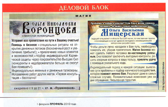 Я, конечно, понимаю, что деньги, получаемые от жуликов, не пахнут. Но тогда, может, им просто начать публиковать гороскопы, анекдоты и выдуманные истории о том, как некий петя мокин переспал со своей тещей? Чтобы, так сказать, соответствовать. Заодно и издание повеселеет, а то сейчас - тоска зеленая. Вот только подобные объявления и веселят.
