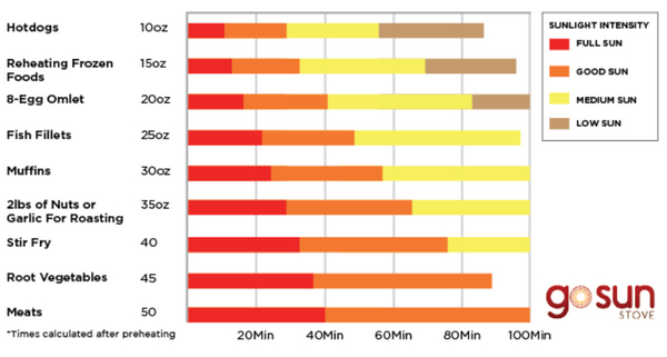 График времени готовки различных продуктов в зависимости от солнца. Утверждается, что устройство позволяет готовить даже когда солнце в облаках, просто времени потребуется больше.