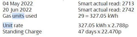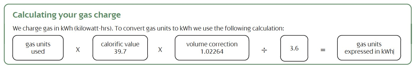 gas units used X calorific value 39.7 X volume correction 1.02264 / 3.6 = gas units expressed in kWh