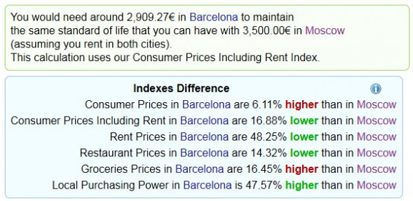 Любопытный сайт, в котором проводится сравнение цен на товары и услуги в различных городах мира - Numbeo (на английском). Вот, например, сравнение Москвы и Барселоны. И вот общий вывод.