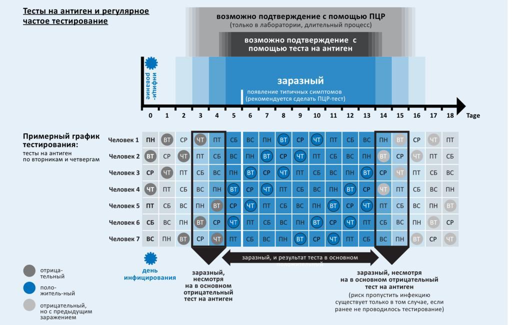 Т.е. если коллега на тебя подозрительно покашлял в понедельник, то заразным ты станешь примерно в четверг, а положительный антиген-тест будет только в субботу.