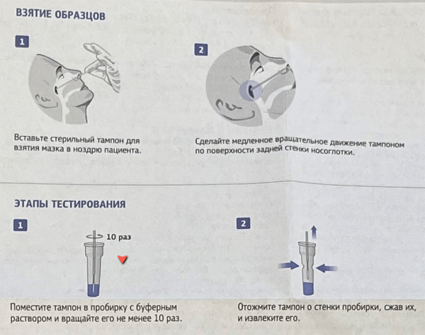 Тест предполагает забор пробы только назофарингеальным способом, т. е. через носоглотку.