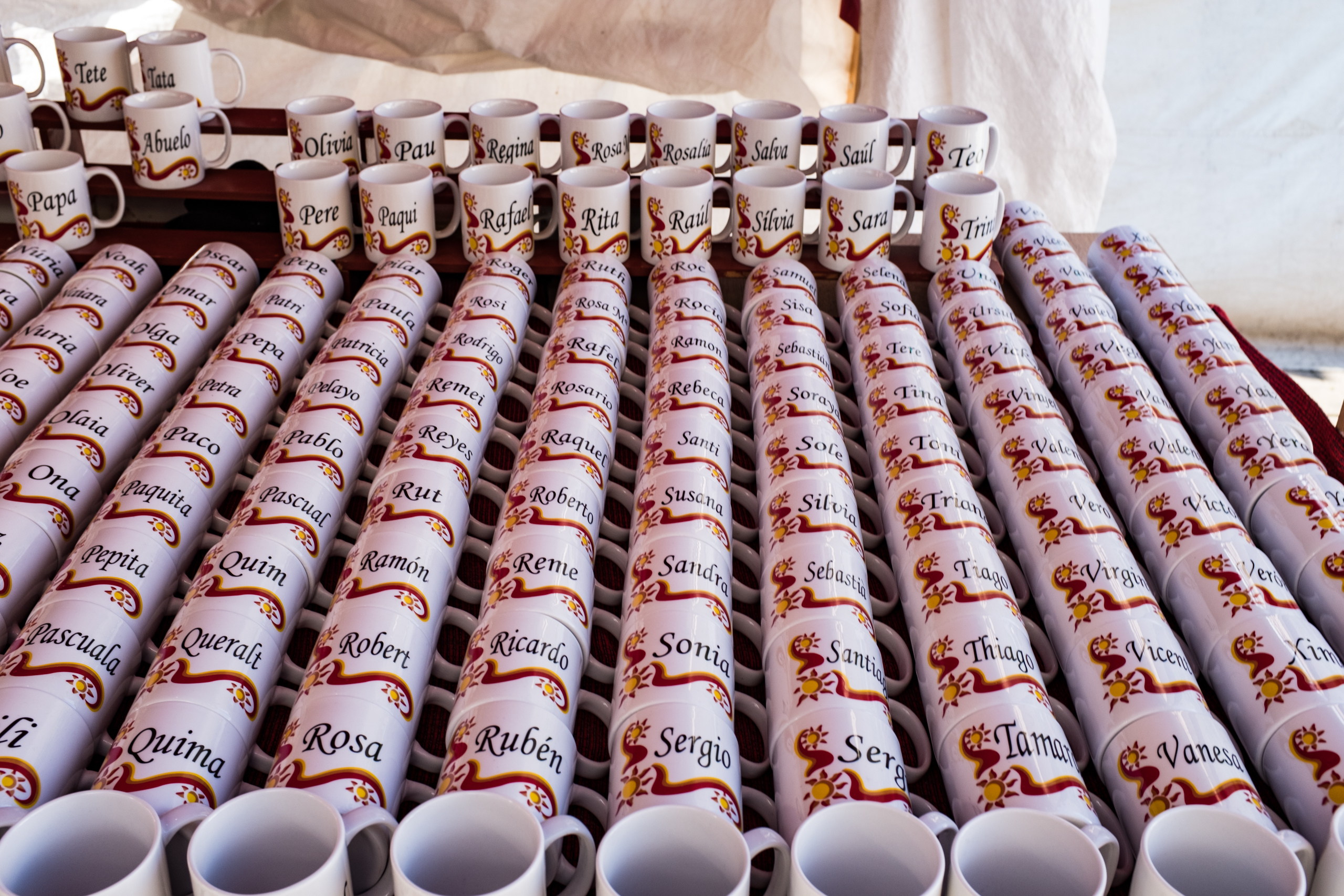Кружечки с именами. Вариантов немного. Чисто каталанских имён почему-то нет. И есть нейтральные - папа, мама, бабушка и так далее. Кстати, имя Паки - это сокращение от Франсиска. Живите теперь с этим знанием.