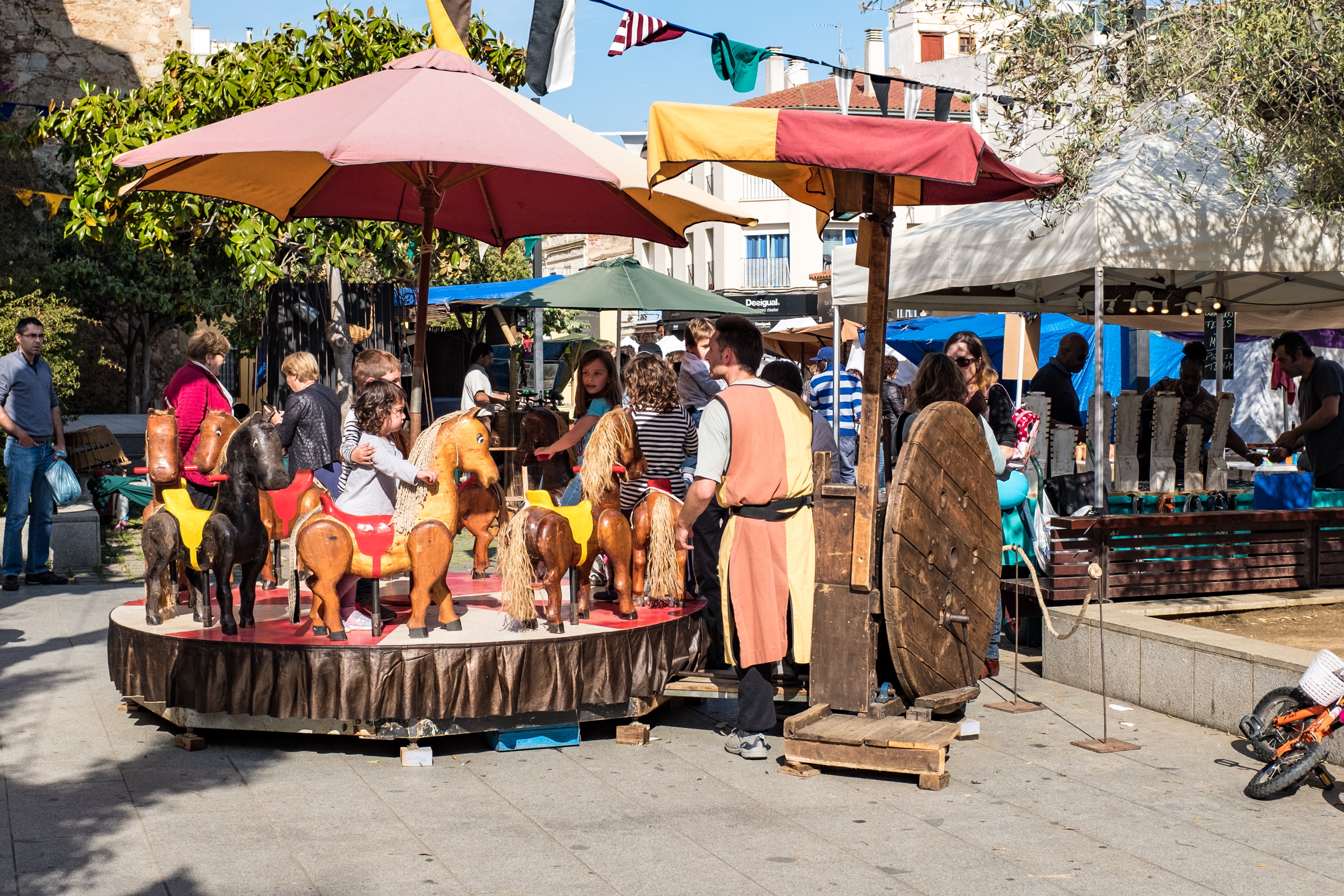 Каждый год - механическая карусель. Мужик крутит большое деревянное колесо, дети катаются.