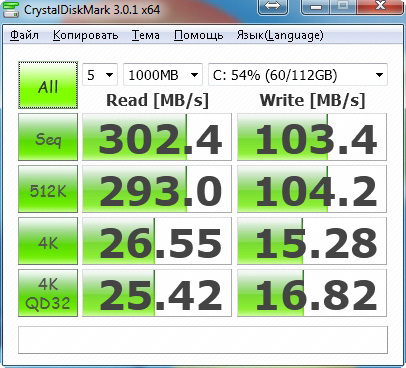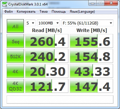 Алекс, такой вредный совет - заполните диск чуть больше, чем наполовину и проведите замеры скорости ещё раз. Вас ждёт неприятный сюрприз. Особенность сандфорса в том, что выдающиеся скорости он показывает только на сжимаемых данных и только в самом начале работы при пустом диске. Потом производительность падает в разы. Но в рекламных проспектах пишут, разумеется, не реальную эксплуатационную скорость