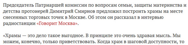 Этот мем еще Матвиенковских времен в Питере. Она всерьезе проталкивала такой проект. Чтобы в каждом микрорайоне была не только трансформаторная будка, но и маленькая часовня для справления острой религиозной нужды.