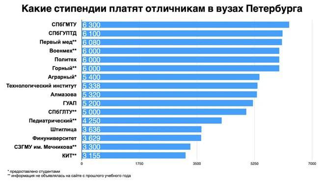 Прислали интересную статистику - стипендии в различных вузах Питера для обычных студентов и для отличников.