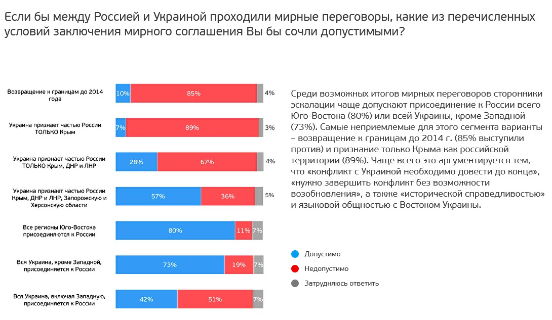 Вопросы так сформулированы, что выводы можно сделать любые. Например, "за мир с учётом сложившейся ситуации" - это типа "противники эскалации" (что чистая правда), но ни разу не противники той самой СВО.