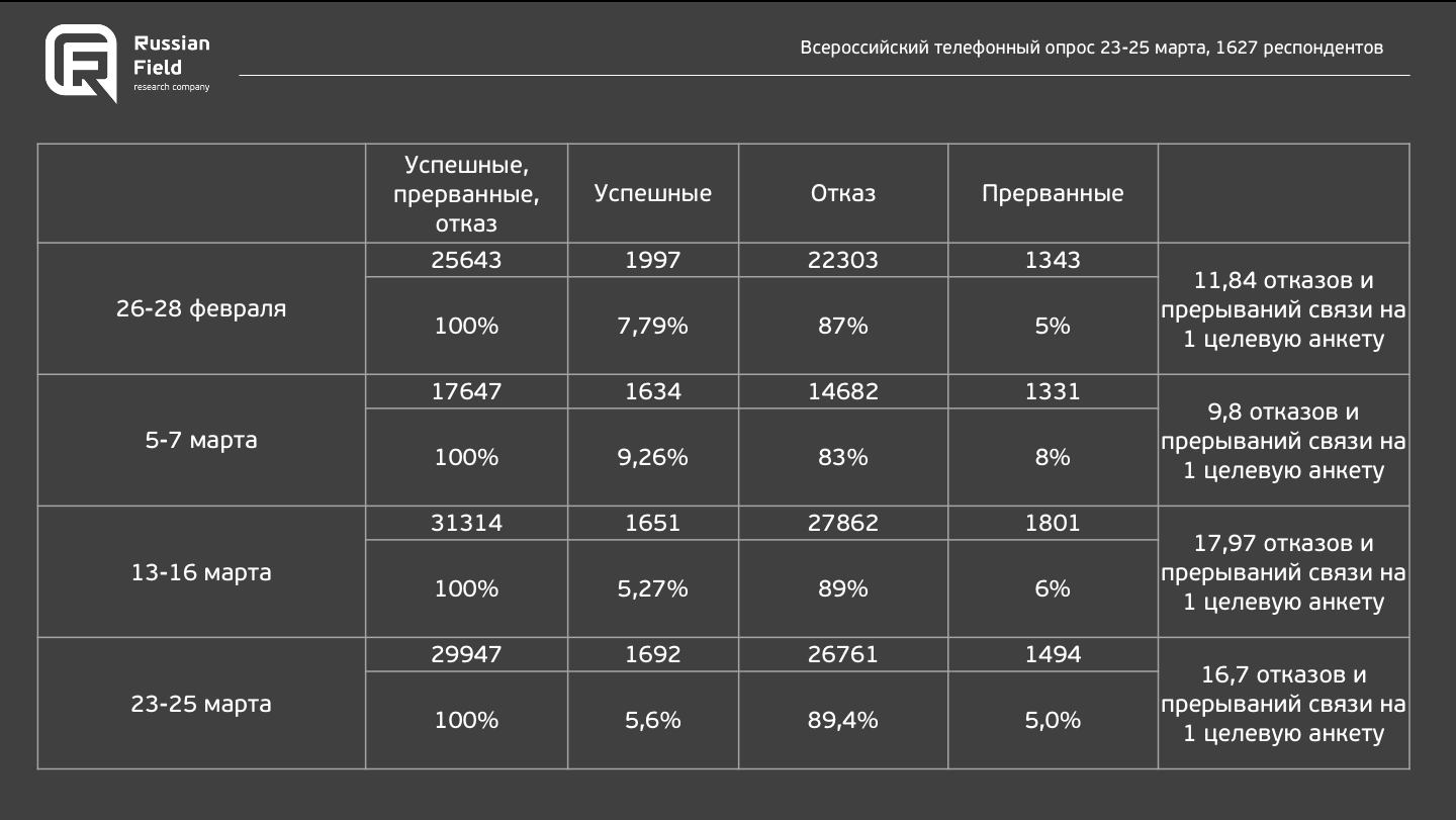 Я вам сейчас накину. Мне за эти полтора года два раза звонили с официальным социальным опросом, название организации я уже не помню, но что то около государственное, как я понял. Опросы были долгие, минут на 10-15, на тему войны, уровня жизни, отношения к власти и их решениям.