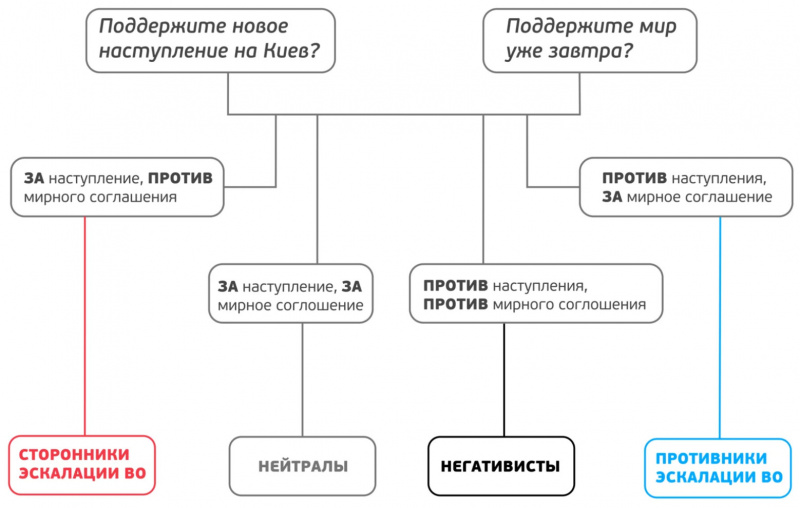 Некоторые сомнения в профессионализме опроса вызывает причисление "ЗА наступление / ЗА соглашение" к "нейтралам". Человек, выступающий за эскалацию войны, нейтралом не может быть по определению. Или это оппортунисты, которым все равно, или (что ещё вероятнее), сторонники эскалации. А "мир" для них - "Украина отдает все 'исконно русские территории' , 'денацифицируется' и разоружается.