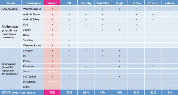 Кстати, Stream - мультиплатформенный сервис, он представлен на большом количестве всевозможных устройств, включая телевизоры Smart-TV и игровые приставки - вот сравнительная табличка.