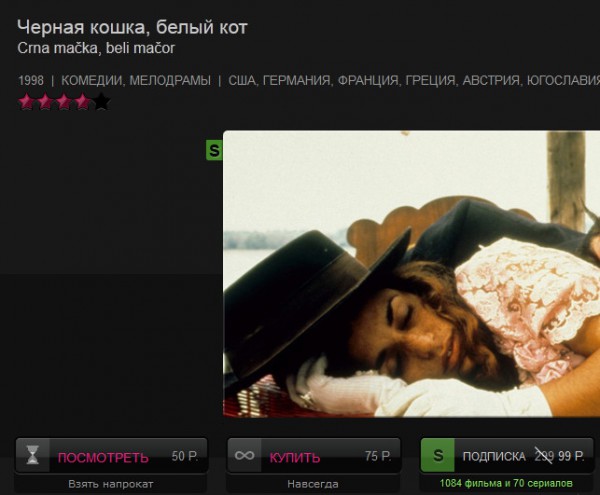 Ну и мы помним, что подписка стоит всего 99 рублей в месяц, а позволяет смотреть 1084 фильмов и 70 сериалов (они отмечены специальной буквой "S").