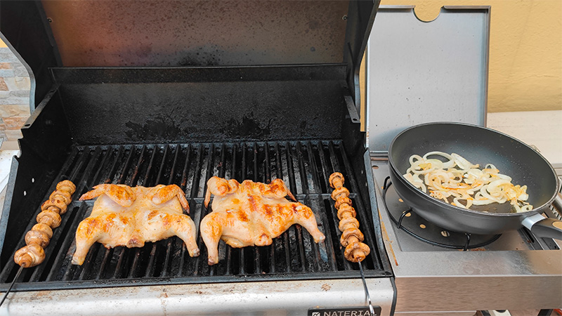 Почти стандартный набор: пара цыплят, предварительно замаринованные в репчатом луке и белом вине, шампиньоны, замаринованные в соевом соусе с чесноком, все это жарится на газовом гриле где-то 20 минут (цыплята - по 5 минут на стороне и переворачивать, грибы поворачивать каждые пару минут), лук от маринада поджаривается на сковородке, на гарнир - всякие мои домашние овощное рагу, перцы или кабачки, ну и субботний обед готов. К этому еще хорошо охлажденного белого вина - и становится совсем хорошо.