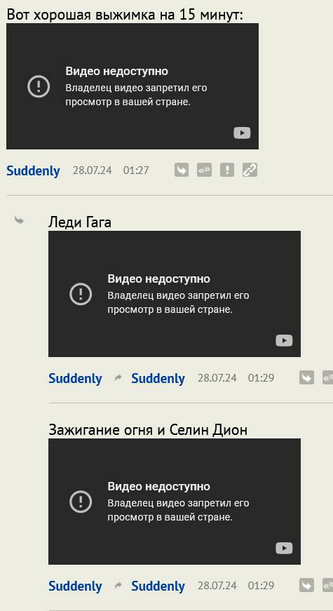 Алекс, и опять, в который раз "запретил просмотр в вашей стране". Понимаю, что у вас проверить это нереально. Но было бы нелишне в тексте, представляющем клип, привести его название так, как оно написано на Ютубе. Тогда мы смогли бы сами поискать открытые варианты. Так что же это был за клип?
