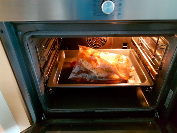 Потом половину пулярки запекли в духовке в рукаве, заранее замариновав. Получилась мягкая и нежная, но жареная мне понравилась больше.