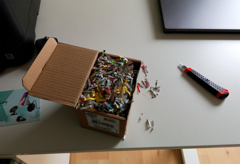 Ребёнку про это не говорите. Использовать paper shreds as packing это один из способов быть eco-friendly. Многие из контор что занимаются переработкой вторсырья их не берут, так что им либо в компост(есть ограничения тоже) либо на свалку. Или вот в вашу коробочку ещё послужить.