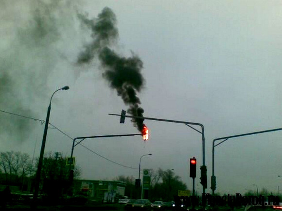 Тогда бы все светофоры в округе так дымили бы. )) А это просто новый знак стопа - проедешь на красный - совсем сгоришь, нах...