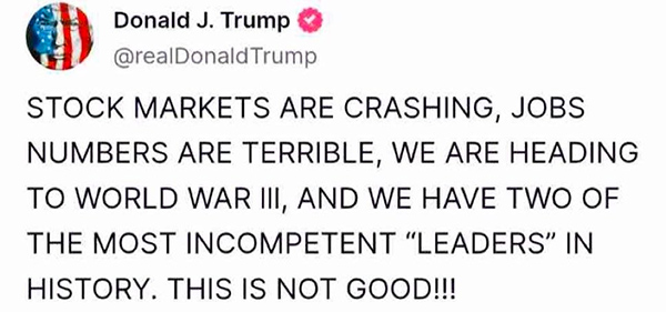 ФОНДОВЫЕ РЫНКИ ПАДАЮТ, ПОКАЗАТЕЛИ ПО ЗАНЯТОСТИ УЖАСНЫЕ, МЫ ДВИЖЕМСЯ К ТРЕТЬЕЙ МИРОВОЙ ВОЙНЕ, А У НАС ДВА САМЫХ НЕКОМПЕТЕНТНЫХ «ЛИДЕРА» В ИСТОРИИ. ЭТО ПЛОХО!!!