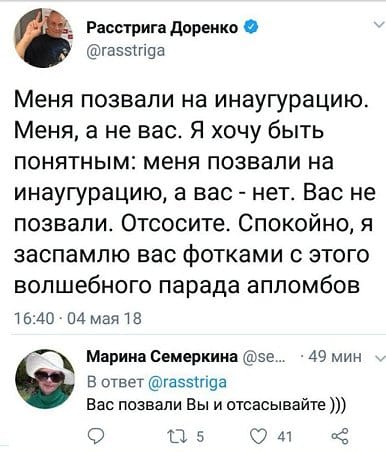 Доренко - такой трогательный. Его позвали. Его, а не нас. Отсосите. Его позвали. Он завалит нас фоточками с этого волшебного парада. Апломбов.