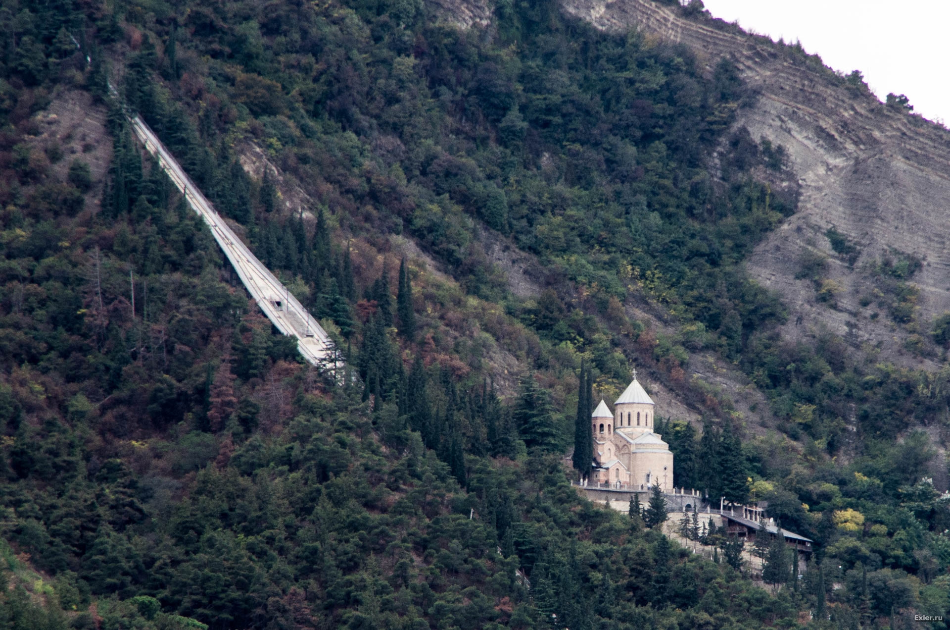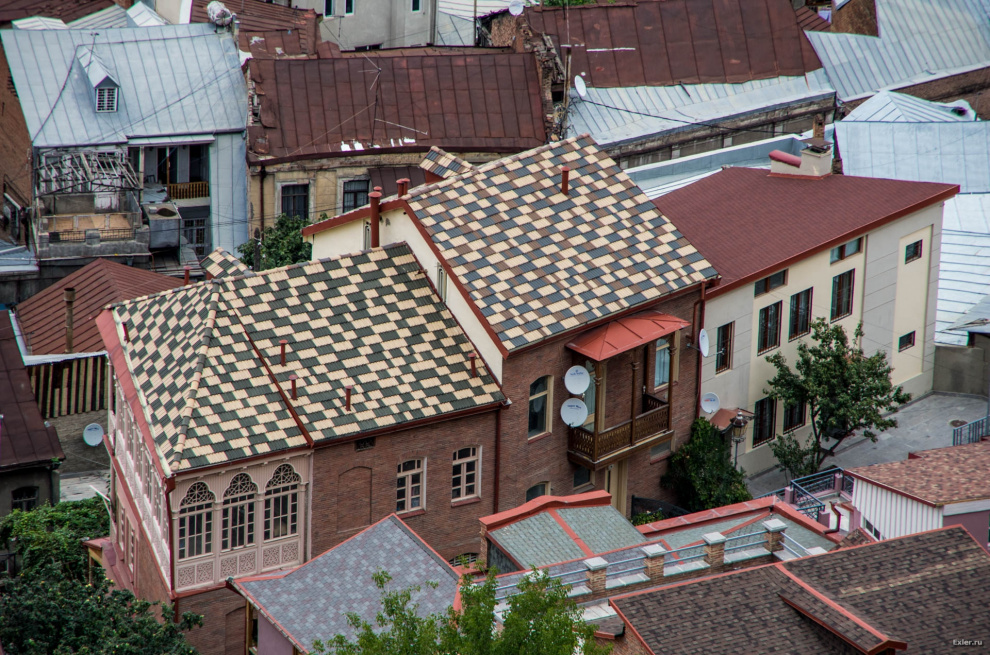 Вид сверху на президентский дворец, под которым - причудливые строения суперсовременного концертного зала, который также строился по инициативе Саакашвили. Достроить концертный зал не успели, ну и новые власти строительство остановили, хотя комплекс почти готов. Многие считают, что эти две трубы, как и мост-"прокладка", сильно портят вид города.