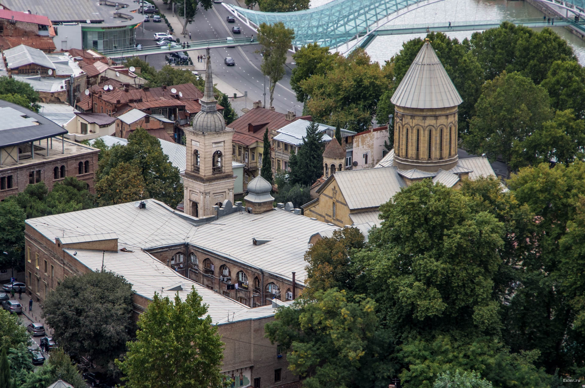 Правее виден знаменитый Храм Сиони - исторически главный храм Тбилиси и один из двух главных в Грузинской церкви; назван в честь Сионской горы и освящён в честь Успения Пресвятой Богородицы. До открытия Собора Святой Троицы здесь находилась кафедра католикоса Грузии.