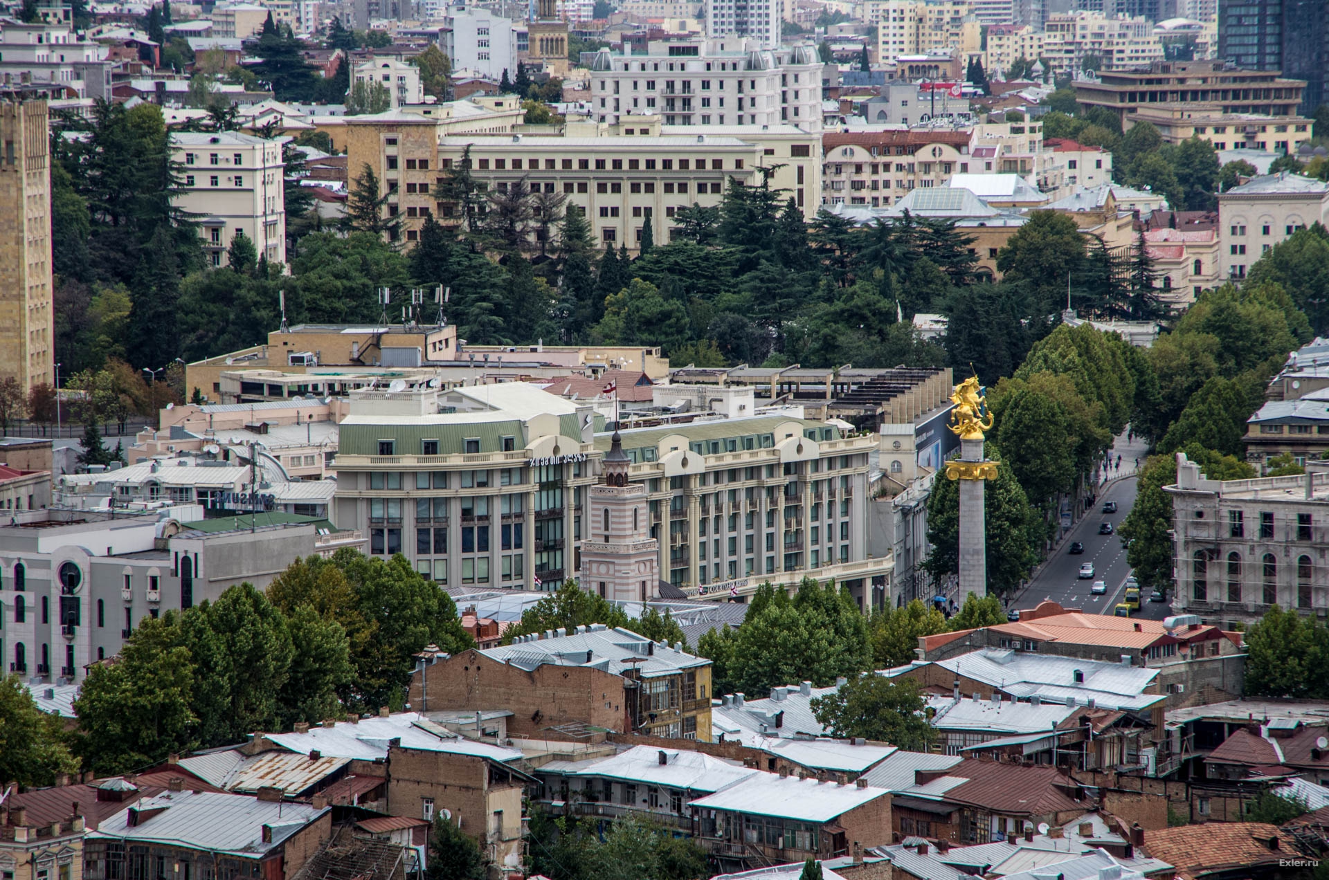Вид на Площадь Свободы. Раньше там стоял здоровенный памятнику Ленину (кому же еще, действительно). Сейчас там расположено творение Церетели - Памятник Свободы. Памятник на фото хорошо виден - вот он, с золотистой фигурой святого Георгия, в очередной раз убивающего дракона.