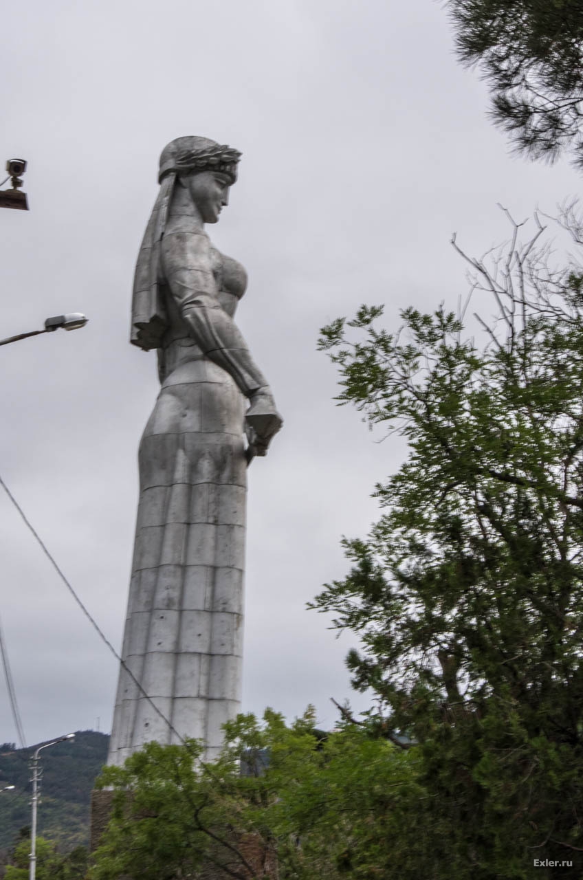 Монумент Мать Грузии (Мать Картли). В правой руке фигура держит меч - для тех, кто пришел как враг и не хочет пить вино, в левой руке - чашу вина для тех, кто пришел как друг и хочет пить вино.