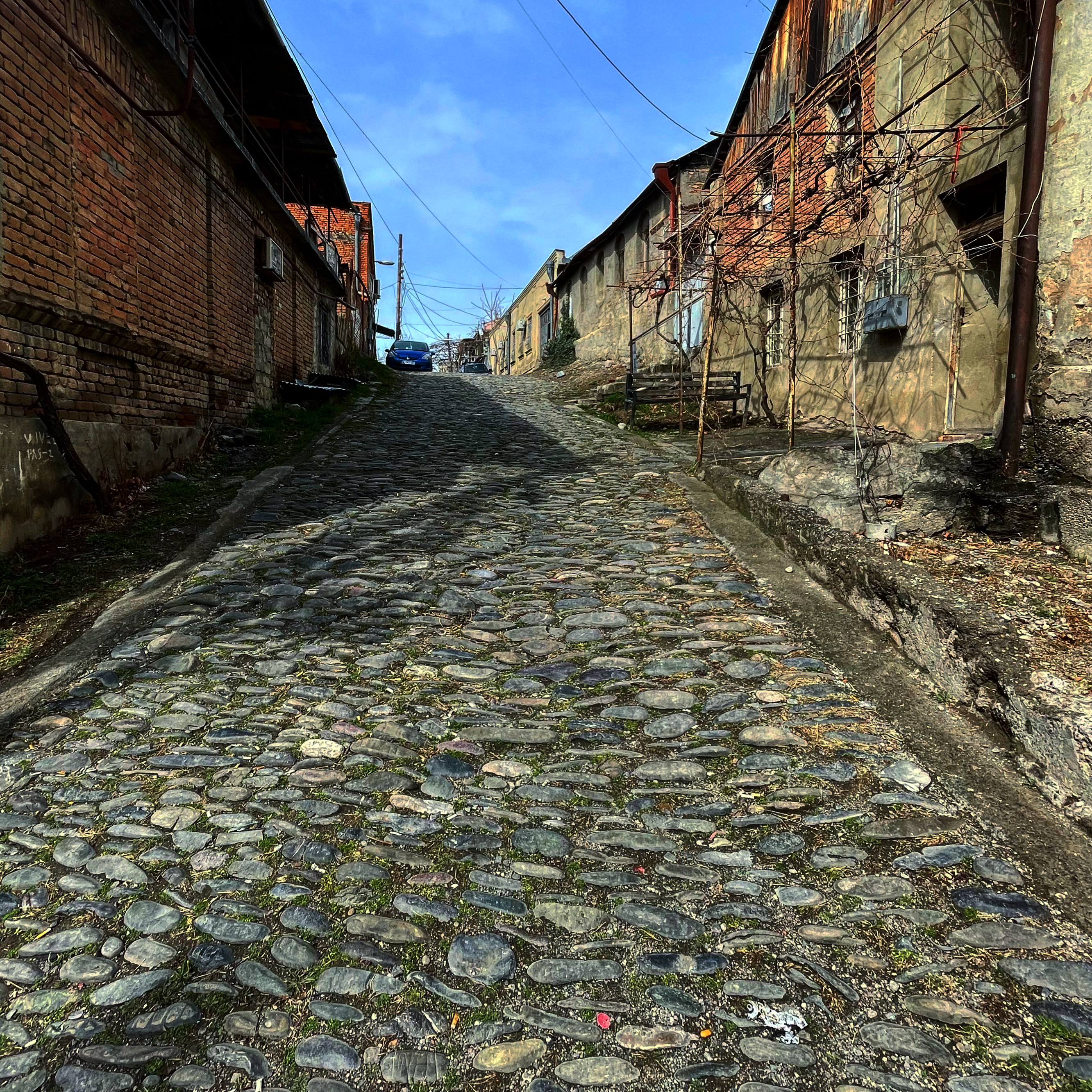 Саакашвили в свое время хотел выкупить у жителей эти дома и квартиры по реально высокой цене за метр и сделать тут новый красивый район. Но когда жители посчитали свою жилплощадь с учетом балкончиков, чуланов и так далее, общая сумма получилась настолько непомерная, что от этой идеи отказались. И в знак ответной любезности правительство объявило этот район историческим, и это означало запрет на любые внешние перестройки. В результате район вылядит как после атомной бомбардировки - вы это сейчас увидите.